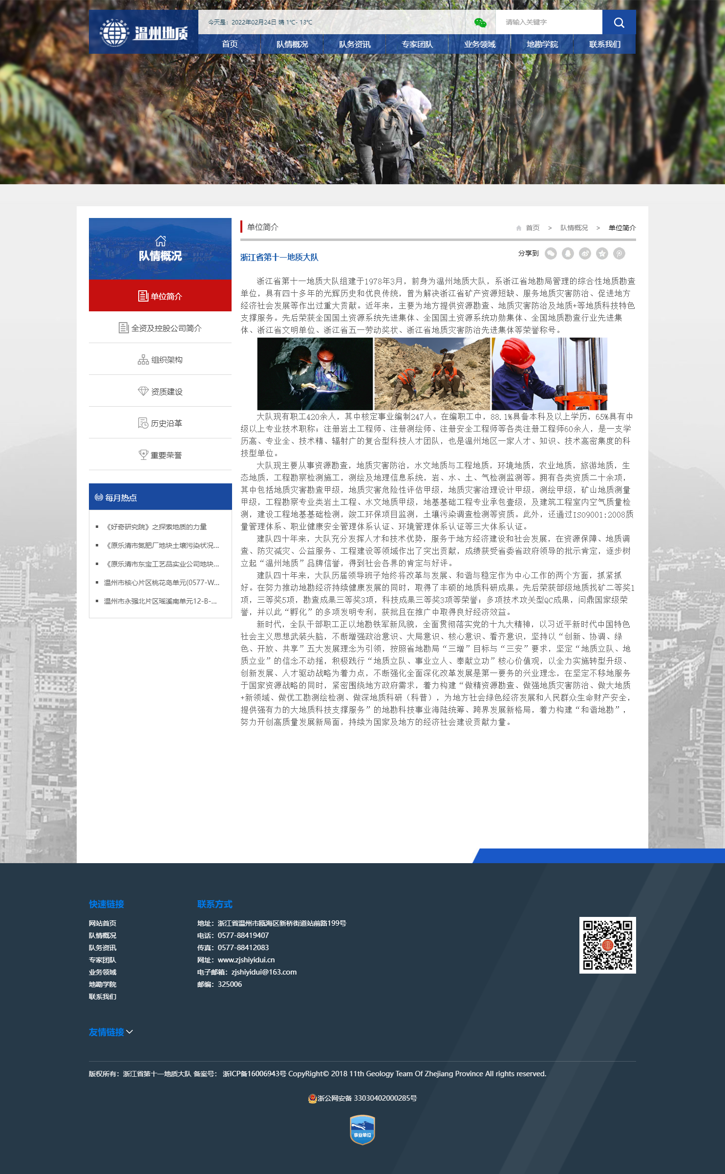 浙江省第十一地質(zhì)大隊(duì)組建于1978年3月,前身為溫州地質(zhì)大隊(duì),系浙江省地勘局管理的綜合性地質(zhì)勘查單位,具有四十多年的光輝歷史和優(yōu)良傳統(tǒng),曾為解決浙江省礦產(chǎn)資源短缺、服務(wù)地質(zhì)災(zāi)害防治、促進(jìn)地方經(jīng)濟(jì)社會(huì)發(fā)展等作出過重大貢獻(xiàn)。近年來,主要為地方提供資源勘查、地質(zhì)災(zāi)害防治及地質(zhì)+等地質(zhì)科技特色支撐服務(wù)。先后榮獲全國國土資源系統(tǒng)先進(jìn)集體、全國國土資源系統(tǒng)功勛集體、全國地質(zhì)勘查行業(yè)先進(jìn)集體、浙江省文明單位、浙江省五一勞動(dòng)獎(jiǎng)狀、浙江省地質(zhì)災(zāi)害防治先進(jìn)集體等榮譽(yù)稱號(hào)。