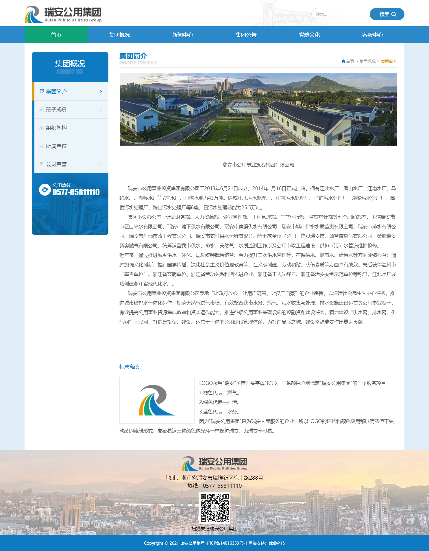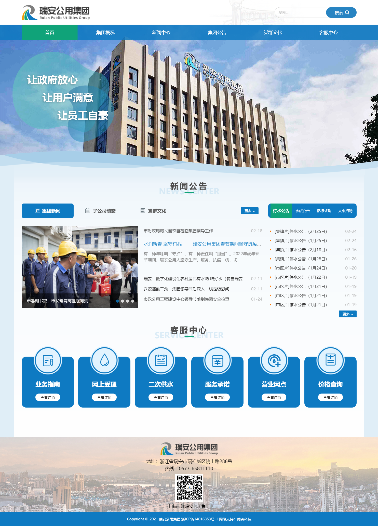 瑞安市公用事業(yè)投資集團有限公司秉承“讓政府放心、讓用戶滿意、讓員工自豪”的企業(yè)宗旨,以保障社會民生為中心任務,推進城市給排水一體化運作,規(guī)范天然氣供氣市場,有效整合我市水務、燃氣、污水收集與處理、排水設(shè)施建設(shè)運營等公用事業(yè)資產(chǎn),有效提高公用事業(yè)資源集成效率和資本運作能力,推進各項公用事業(yè)基礎(chǔ)設(shè)施的投融資和建設(shè)任務,著力建設(shè)“供水網(wǎng)、排水網(wǎng)、供氣網(wǎng)”三張網(wǎng),打造集投資、建設(shè)、運營于一體的公用建設(shè)管理體系,為打造品質(zhì)之城、建設(shè)幸福瑞安作出更大貢獻。